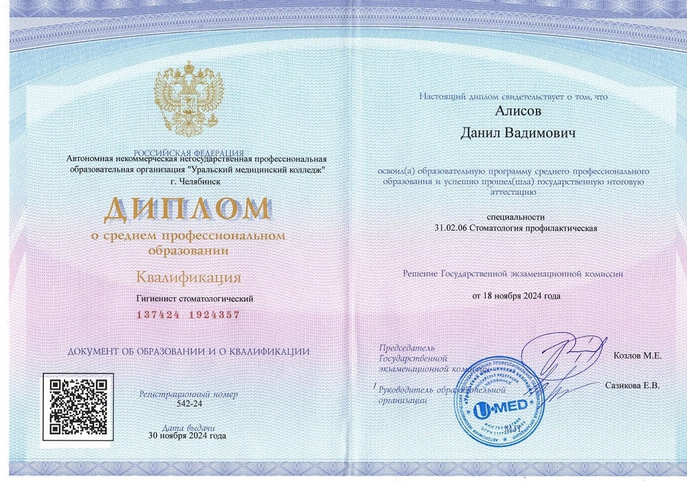 Здравствуйте! Меня зовут Алисов Данил, я гигиенист стоматологический. Занимаюсь профилактикой зубов и дёсен в клинике Доминанта.
