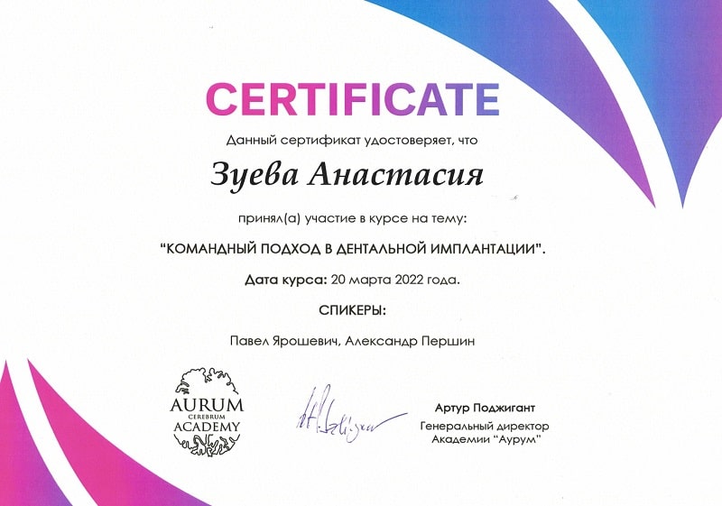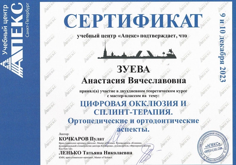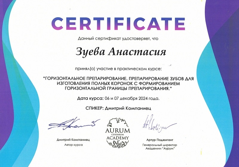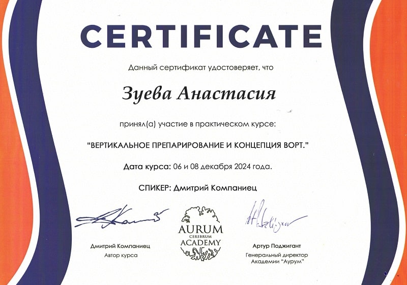 Меня зовут Зуева Анастасия Вячеславовна. Я врач стоматолог ортопед со стажем более 9 лет.