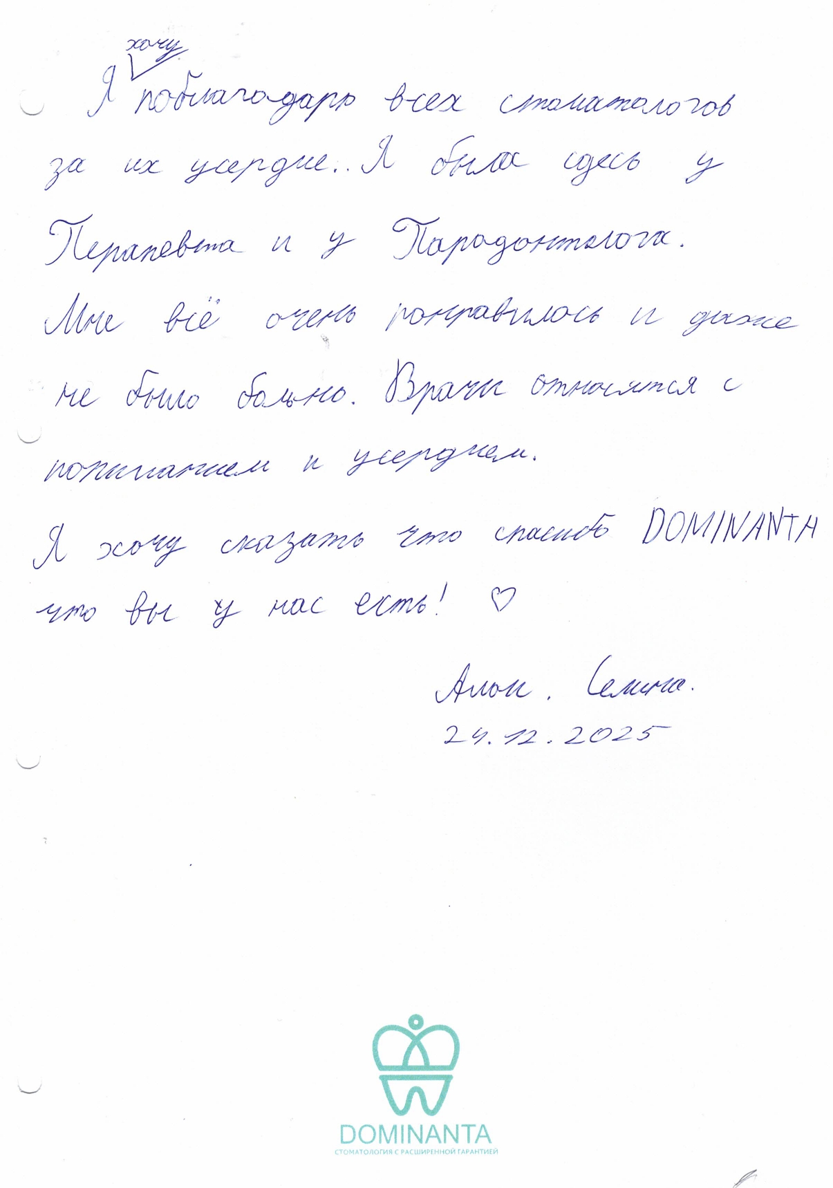 Я была настроена на длительное лечение, как в больнице по месту жительства. К счастью, в «Доминанте» все делают быстро, качественно, безболезненно, с добрым отношением. Благодарю за ваш труд, Оксана Николаевна! Теперь я не боюсь стоматологов, как прежде.